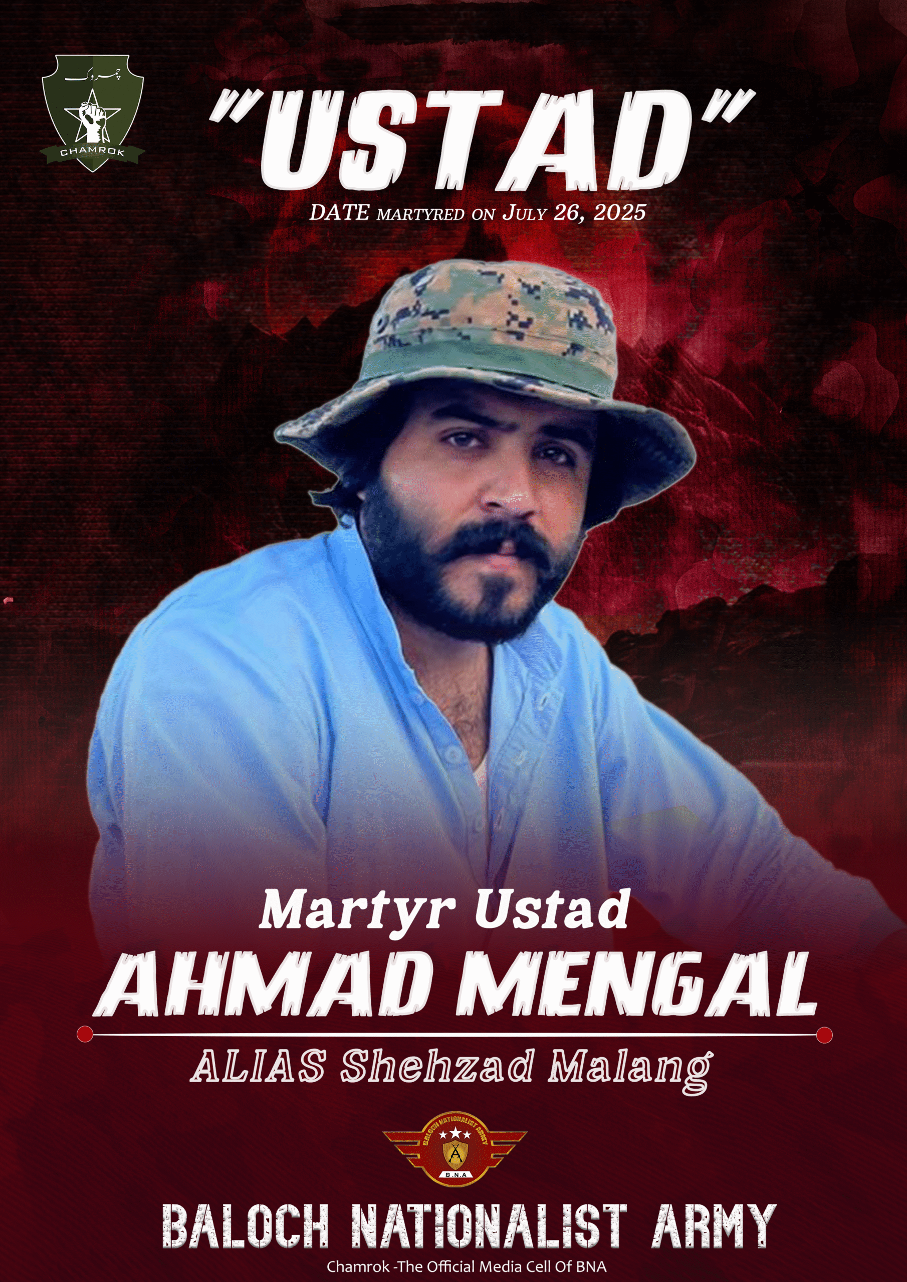 بلوچ نیشنلسٹ آرمی کے ترجمان بیبرگ بلوچ نے میڈیا کو جاری بیان میں کہا ہے کہ ماشکیل میں شہید استاد احمد مینگل، عرف شہزاد ملنگ، 26 جولائی 2025 کو قابض ایران کی بنائی ہوئی ڈیتھ اسکواڈ کی فائرنگ سے شہید ہوئے۔شہید استاد احمد کی شہادت میں ملوث ایران کے بنائے ہوئے ڈیتھ اسکواڈ نیٹ ورک کے تمام کارندوں کی ہماری “انٹیلیجنس ونگ مالک” نے تفصیلات جمع کی ہیں۔ انشاءاللہ  تمام بلوچ دشمنوں کو ان کے انجام تک بہت جلد پہنچایا جائے گا۔شہید استاد احمد نوشکی کے علاقہ کلی غریب آباد کے رہائشی تھے اور ایف سی کے ملازم تھے۔ بلوچ قوم پر ہونے والے مظالم کو دیکھ کر شہید نے 2021 میں دشمن پاکستان کے ملازمت چھوڑ کر 2021 کے اَخِر میں بلوچ قومی جدوجہد میں شمولیت اختیار کی اور اپنی بہادری اور جنگی مہارت سے انہوں نے خضدار، نوشکی، کوئٹہ، مستونگ، سرباز، ایرانشہر، زاہدان،سراوان اور بلوچستان کے کہے علاقوں میں اپنے کارروائیاں سرانجام دیں۔ بی این اے کے کئی اہم آپریشنوں میں وہ صفِ اوّل پر کمان کرتے رہے۔اور آپ ہمارے انٹیلیجنس ونگ مالک کے بھی ایک دستے کے حصہ تھے.جب آپ ایرانی مقبوضہ بلوچستان میں آئے تو آپ نے یہاں پر مختلف علاقوں کا دورہ کیا اور مختلف ساتھیوں کے نیٹ ورکوں کو مضبوط کرنے میں اہم کردار ادا کیا اور علاقائی زمداران کو درس اور تدریس دیتے تھے کہ کس طرح ایک مسلح تنظیم کو منظم اور اپنے اداروں کو کس طرح مضبوط طریقے سے کرنا چاہیےآپ کے ہاتھ کے نیچے بلوچ نشنلسٹ آرمی کا جو ادارہ تھا آپ نے کم وقتی میں دونوں دشمنوں کو اقتصادی اور مالی مشکلات سے سنگین دوچار کیا آپ نے جن علاقوں کا دورہ کیا اج بھی دوست آپ کے اس بات کو دہراتے ہیں کہ شہید *ملنگ* ہمیشہ یہ بات دہراتے تھے کہ جو دن قبر میں لکھی ہے اسے کوئی نہیں روک سکتا ہمیں اپنے قوم کو ذہنی غلامی سے چھٹکارا دینے کے لیے ہمیں اپنی قربانی دینی ہوگی.