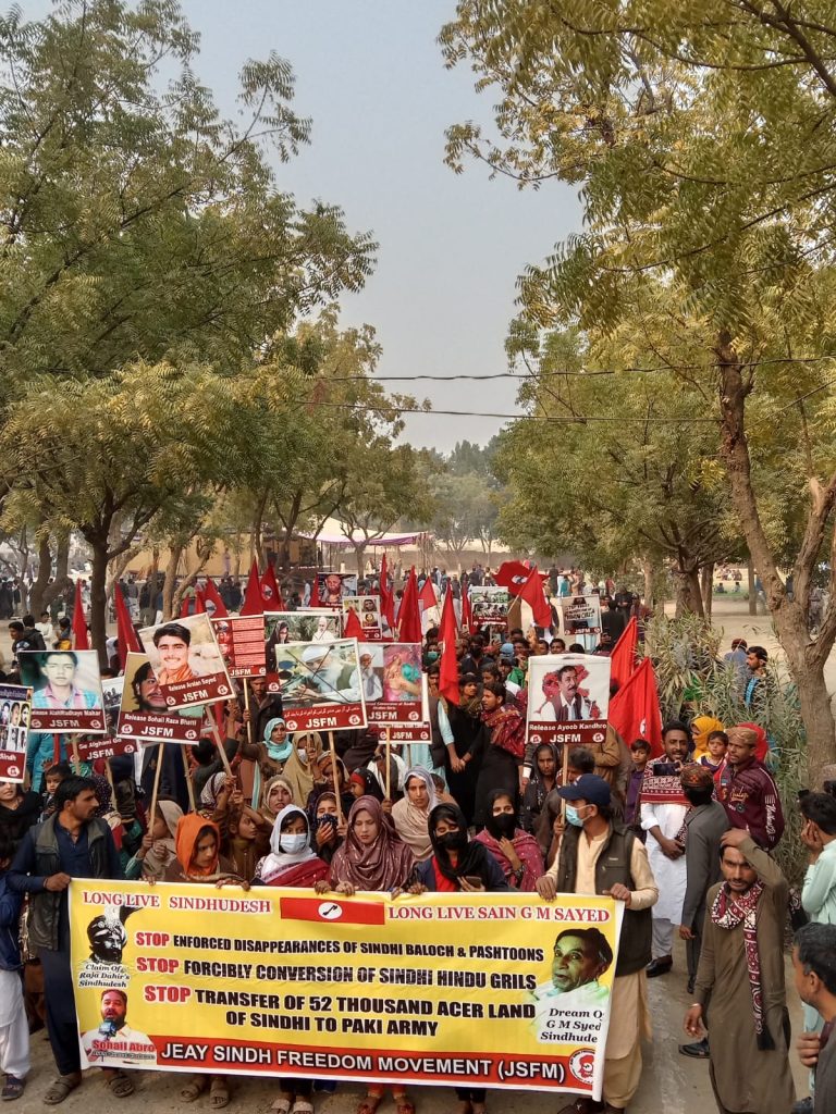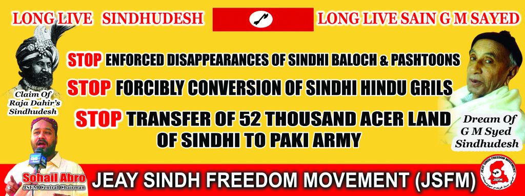 The message on the banner held by people participating in the rally stated, “Stop Enforced Disappearances of Sindhi Baloch and Pashtoons”, “Stop Forcibly Conversion of Sindhi Hindu Girls” and “Stop Transfer of 52,000 acre land of Sindhi to Paki Army,” “Long Live Sindhudesh” and “Long Live Sain GM Sayed.”