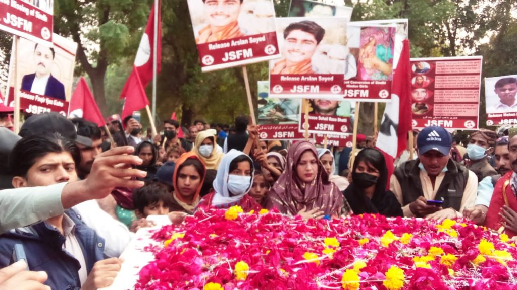 During the rally, the workers carried banners and placards against the forced conversion of Sindhi Hindu girls and the enforced disappearance of political activists from Sindh and Balochistan in Sindh. Participants in the rally shouted slogans of the displeasure of the occupation by the army.