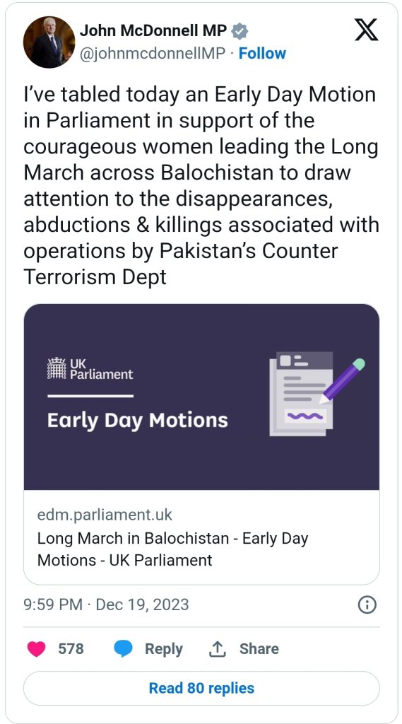 Labour MP, John McDonnell has expressed concerns in the UK parliament regarding the recent long march which has gained limelight worldwide. House expresses its admiration for the courage displayed by the women leading the Long March to Islamabad from across Balochistan to raise awareness of the disappearances, abductions and killings associated with the operations of Pakistan’s Counter Terrorism Department. It also stated that there have been violent attacks on the marching protesters by the Police; and calls upon the Government to raise its concerns about the violation of fundamental human rights against the people of Balochistan with the Pakistani government.