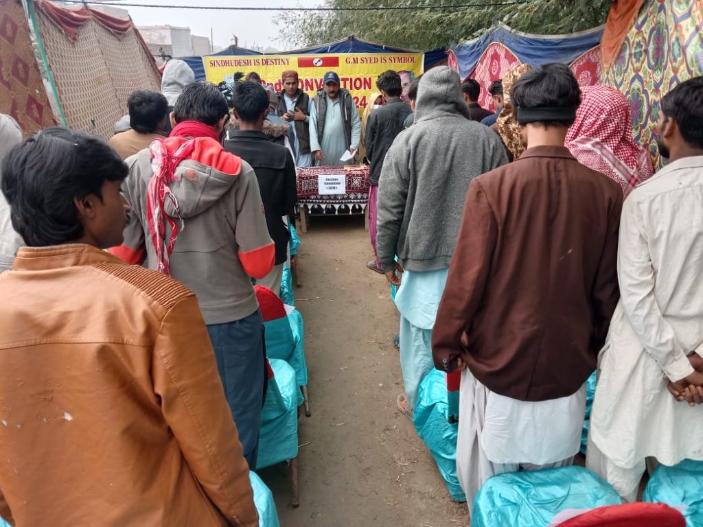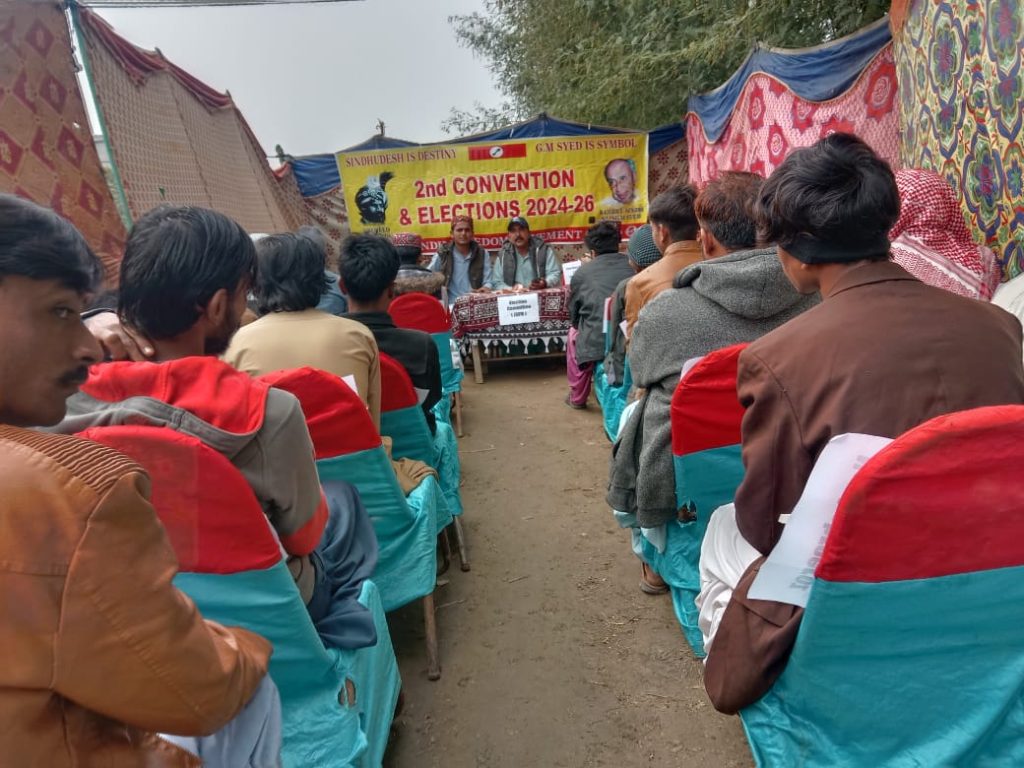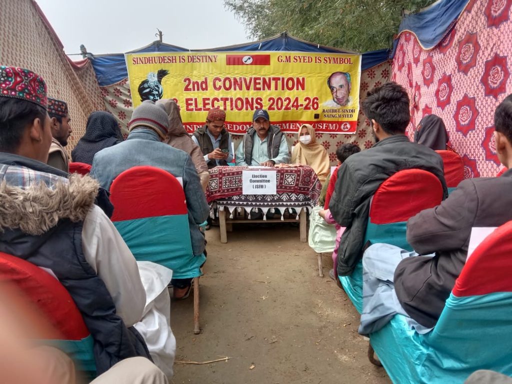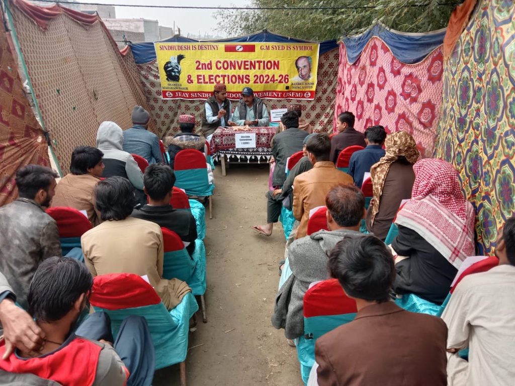 The second convention of the Jeay Sindh Freedom Movement (JSFM) was held in a special session of the National Congress in which the representatives of 21 districts of Sindh participated. The participating districts were Karachi South, Karachi West, Karachi East, Karachi, Korangi, Thatta, Badin, Tando Mohammad Khan, Hyderabad, Mirpurkhas, Matari, Nowsheferoze, Nawab Shah, Jamshoro, Larkana, Sukkur, Khairpur, Dadu, Kashmor, Ghotki, Shikarpur & Jacobabad.