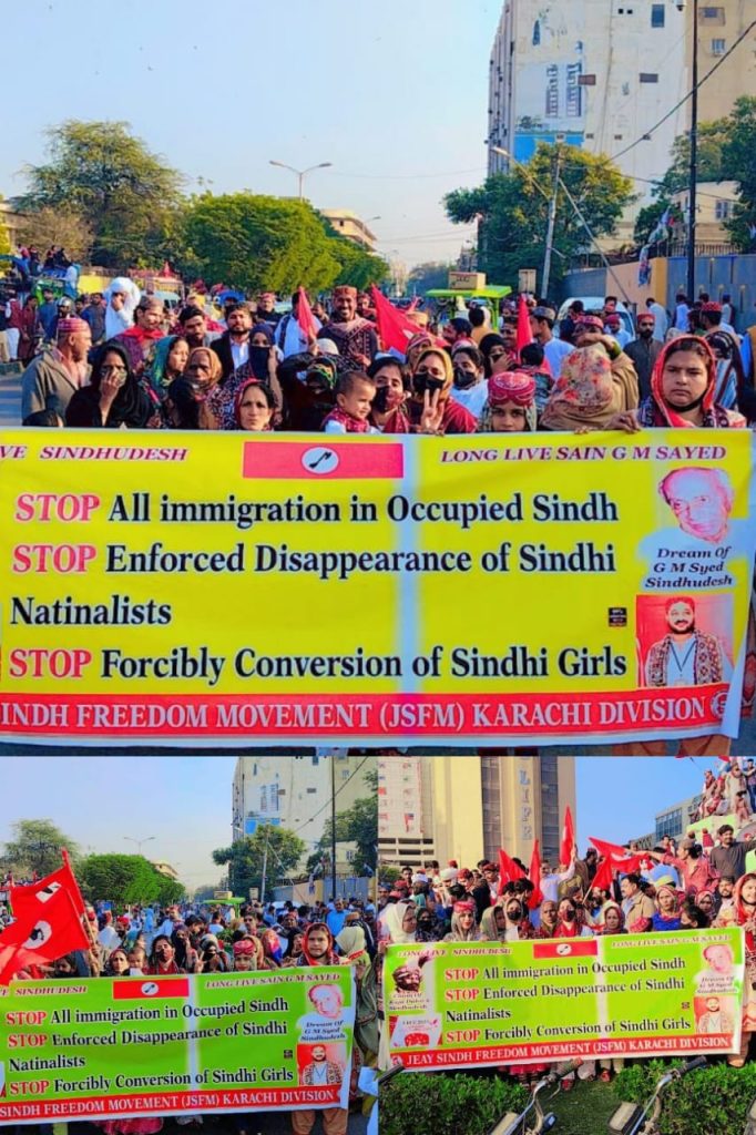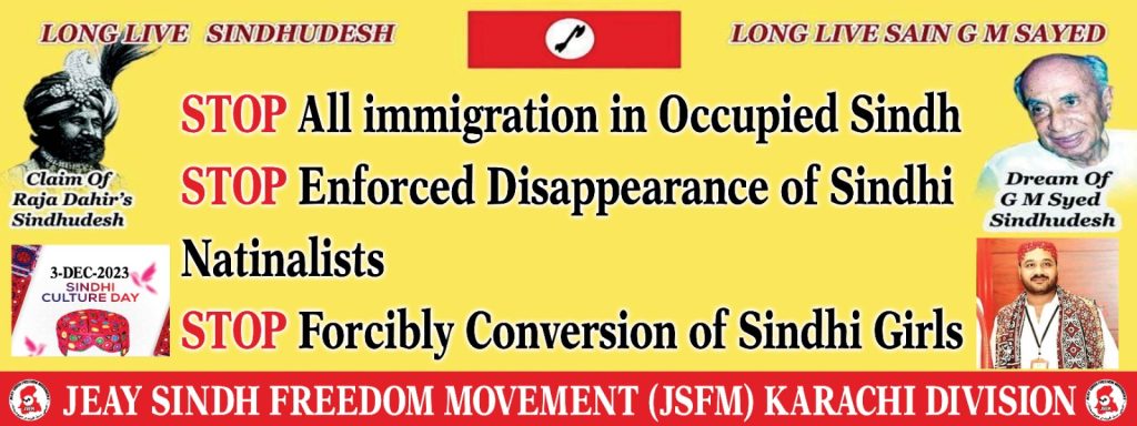 Sohail Abro, Chairman Jeay Sindh Freedom Movement JSFM & Other Central Body Leaders vice Chairman Zubair Sindhi, Acting General Secretary Amar Azadi, Sodho Sindhi, Hafeez Deshi, Pireeh Sindhu stated in Joint Press released his message on international Human Rights Day that Since occupation of Punjab in 1947, Baloch ,Sindhis, Pushtoons, Seraiki, Gilgati and Kashmiri are paying very big cost of colonization. We lost our National Geographical, political, economical and cultural Freedom. Balochistan and Sindh produce 95 of natural resources and Punjab takes all its economical advantage. It is violation of international human rights norms but no one hear voice.